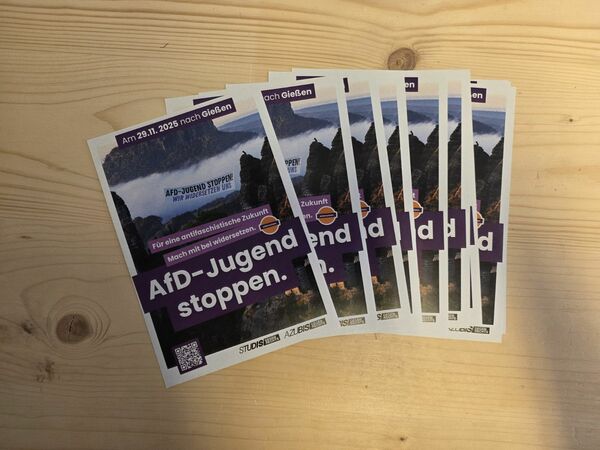 280 Flyer (DIN A5) zur Mobilisierung der bundesweiten Proteste gegen die Neugründung der AfD-Jugend am 29.-30. November 2025 in Gießen.