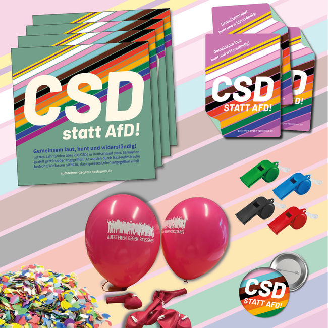 100 Flyer "CSD statt AfD" 100 Aufkleber "CSD statt AfD" 5 Luftballons "Aufstehen gegen Rassismus" 3 Pfeifen 2 Buttons "CSD statt AfD" Konfetti !