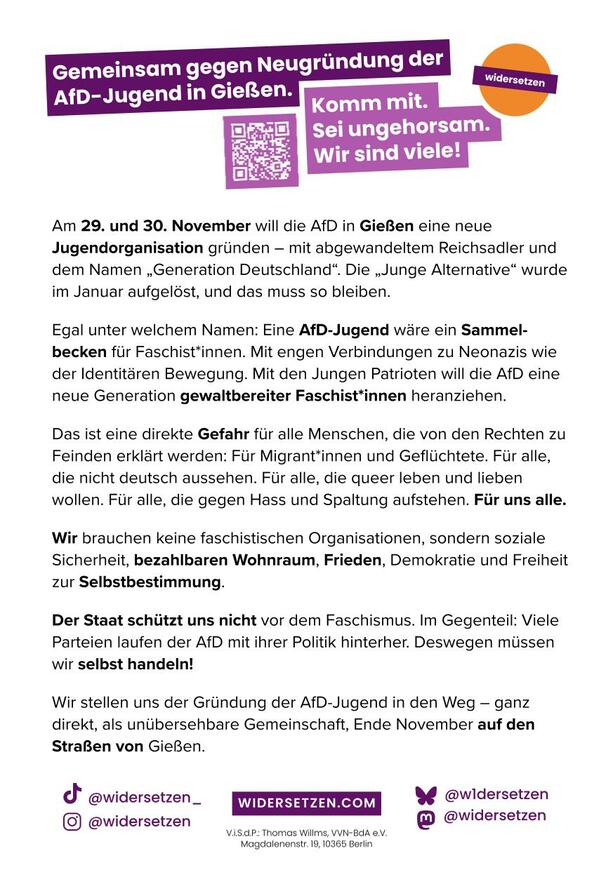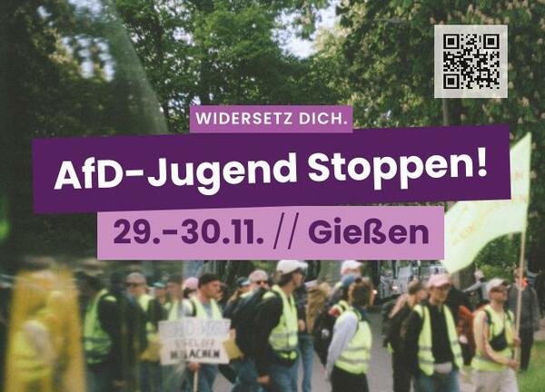 Kleines Materialpaket zur Mobilisierung der bundesweiten Proteste gegen die Neugründung der AfD-Jugend am 29.-30. November 2025 in Gießen.