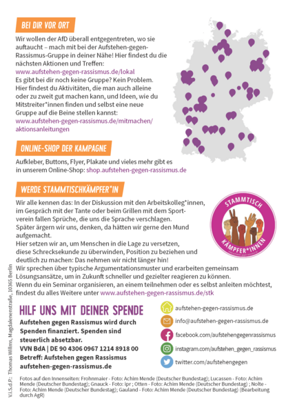 Diesen und weitere aktuell verfügbaren Flyer (u.a. zum Antifeminismus der AfD) und mehr findest du auf: https://www.aufstehen-gegen-rassismus.de/material/flyer-etc/
