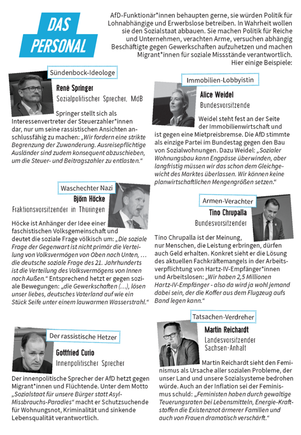 Anlässlich stark steigender Preise versucht die AfD, an Existenzsorgen von Arbeit- nehmer*innen und Abstiegsängste der Mittelschichten anzuknüpfen. In dem Flyer wird aufgedeckt: Wer unter niedrigen Löhnen leidet oder erwerbslos ist, hat von der AfD nichts Gutes zu erwarten.
