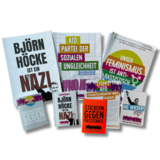 * 120 aktuelle Flyer, z.B. "AfD: Eine Gefahr für Beschäftigte", "AfD: Partei der sozialen Ungleichheit" u.a. * 200 Aufkleber (verschiedene Motive) * 50 Stammtischkämpfer*innen-Flyer * 25 Pocket-Broschüren * 8 Aktionsanleitungen * 1 Broschüre "Mythos Neutralitätsgebot"